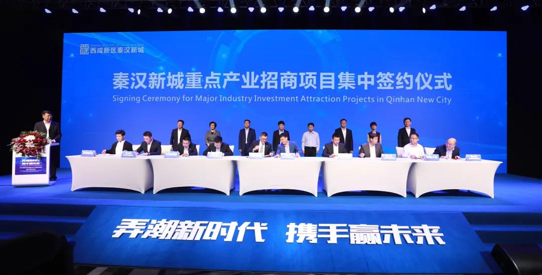 弄潮新時代,攜手贏未來。9月23日下午,2020年西咸新區秦漢新城重點產業招商項目集中簽約,總投資額達190億的15個重點產業項目落戶,為城市高質量發展注入產業新動能。西安市政協主席、西咸新區黨工委書記岳華峰,西安市委常委、西咸新區管委會主任康軍,陝西省工信廳二級巡視員李昭利,陝西省商務廳二級巡視員李亞榮,西安市發改委主任邢欣,西安市投資合作局局長黃瑜暉,秦漢新城管委會主任楊佔文,西咸新區管委會副主任陳輝,陝西省發改委總經濟師王锫等出席並見証簽約,秦漢新城管委會副主任許壽琨主持簽約儀式。