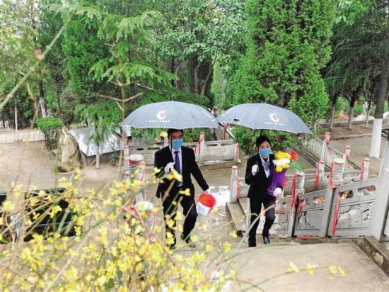 西安凤栖山人文纪念园工作人员手捧鲜花,拿着祈福丝带、追思卡等祭扫用品代客祭扫。 本报记者 喜顺摄