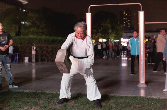 晚上8时一到,曹安江背着包准时出现在健身区,从包中掏出一个无线音箱,放起音乐。他吆喝两声,老汉们纷纷聚拢过来,一个接一个脱掉上衣,亮出结实的胸大肌、8块腹肌,接过曹安江递过来的臂力棒、腹肌轮,在草地上摆好他们自制的45斤重的石锁……展示开始了。