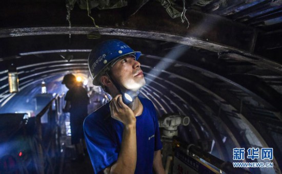 中铁隧道局的技术员在掘进机机头处检查钢拱架的安装(11月19日摄)。