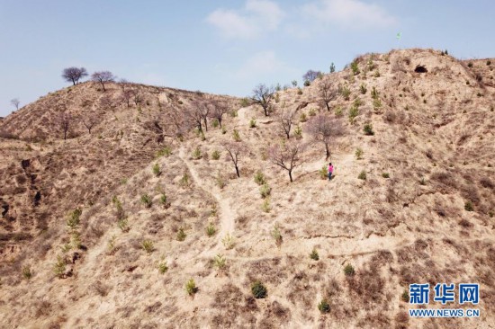 3月11日,在平凉市崆峒区白水镇焦庄村北山,张文玉在山坡上查看栽植的油松(无人机照片)。